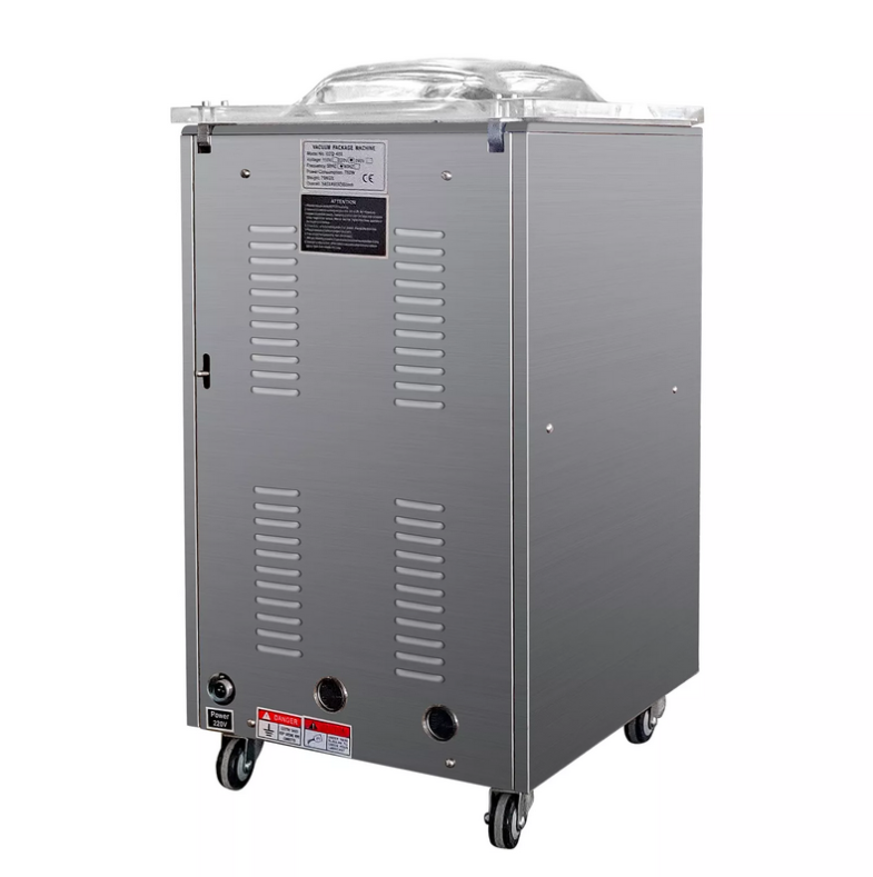 DZQ-400 to profesjonalna, komorowa pakowarka próżniowa w wersji pionowej (upright) – wygodna do pracy na stojąco, mobilna (na kółkach) i gotowa do działania „od razu po rozpakowaniu”. Idealna do pakowania żywności i produktów wymagających dłuższej świeżości, lepszej higieny i estetyki.